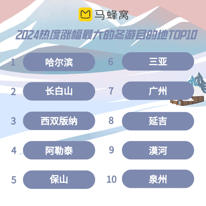天气渐寒,马蜂窝发布2024年冬季“旅行蜂向标”,根据马蜂窝平台的用户浏览、搜索、分享、消费、评价等旅游大数据,对最新的冬季旅行消费趋势进行分析和预测,启发游客冬季旅行灵感,为游客提供出行决策参考。