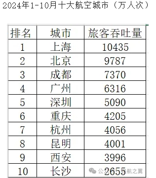 先来看看2024年1-10月份的十大航空城(不含港澳台地区)。