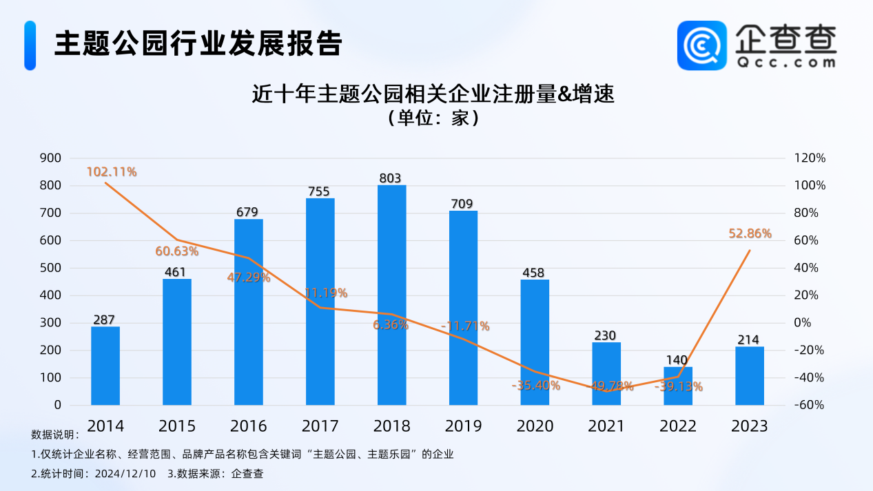 企查查数据显示,国内现存主题公园相关企业3353家。近十年相关企业注册量呈上下波动态势。2023年全年注册214家主题公园相关企业,同比增长52.86%。截至目前,今年已注册169家相关企业。