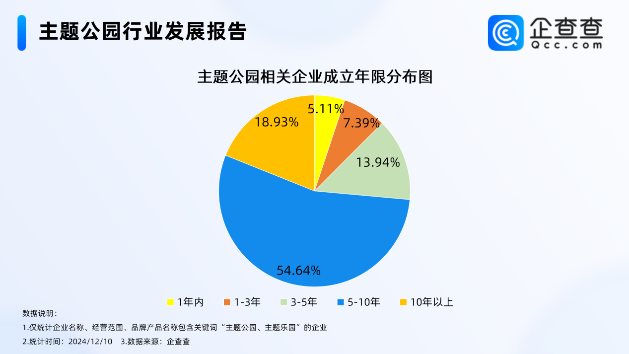 企查查数据显示,从成立年限分布来看,现存主题公园相关企业中,成立年限在5-10年的相关企业最多,占比54.64%。其次,成立年限在10年以上的相关企业占比18.93%。