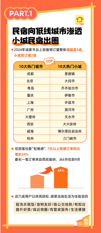 来自途家民宿发布的《2024年民宿观察》显示,2024年热门小城民宿预订量同比增2倍。民宿进入“情绪价值”消费时代,平台上近八成用户优先预订有附加特色体验项目的民宿。带有农事采摘、非遗、民俗、轰趴聚会等标签的民宿预订量同比增长90%-170%。
