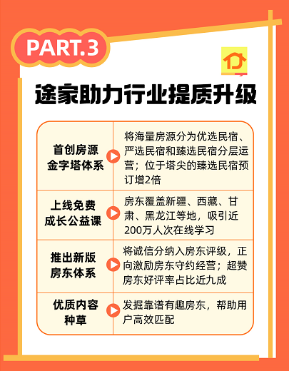 为了提升房东的服务能力,途家民宿2024年上线成长公益课,覆盖了新疆、西藏、甘肃、黑龙江等地近200万人次,助力他们进阶跃升;并组织多场线下交流会等房东社区活动,让房东们互帮互助交流服务经验。