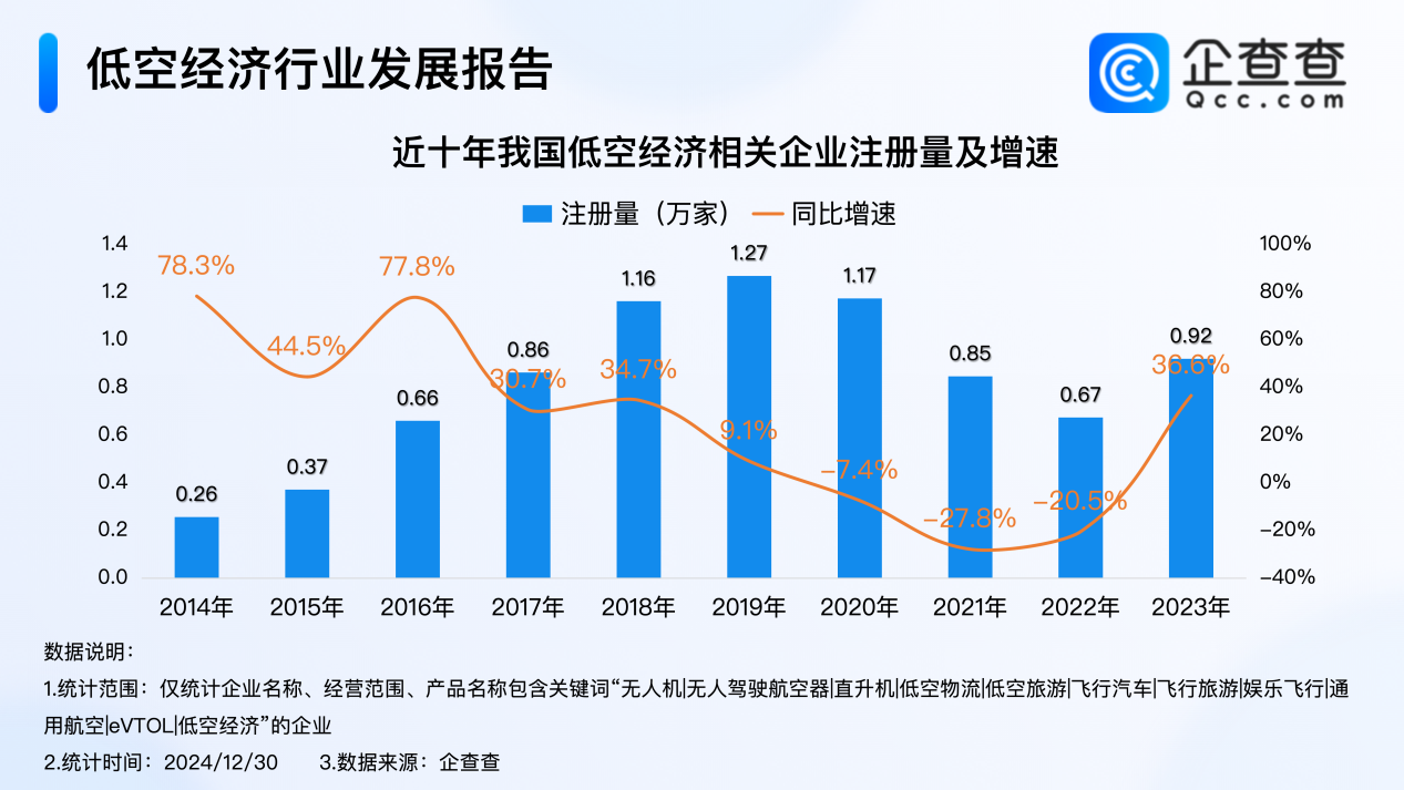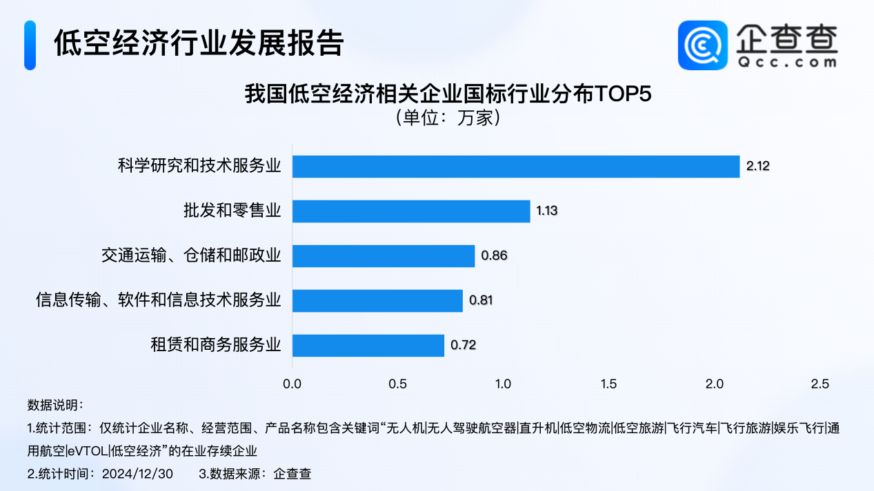 企查查数据显示,截至12月30日,2024年我国低空经济相关企业注册量达1.03万家,已超2023年全年。企业存量方面,我国现存7.5万家低空经济相关企业,行业分布上,归属科学研究和技术服务业的企业最多,占比28.4%;注册资本区间分布上,我国低空经济相关企业注册资本超千万的企业占比近三成。