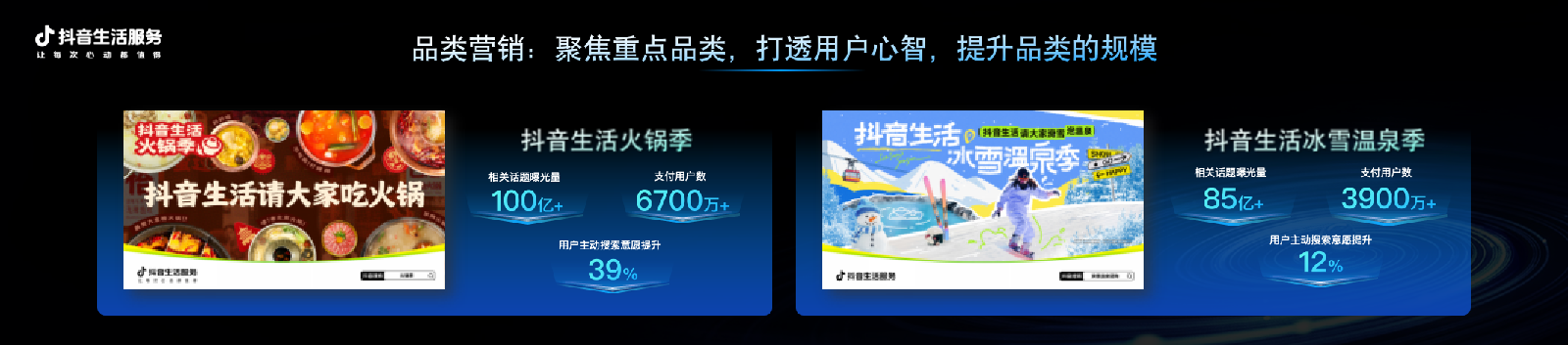 在频道营销方面,平台持续丰富日常促销场景,打造了“吃喝玩乐新体验”“周末专场活动”等常态化营销阵地。以“周末专场活动”为例,全年活动曝光超700亿,交易额同比增长213%,支付订单数同比增长285%。同时,结合不同季节特点,平台推出了“抖音生活火锅季”“冰雪温泉季节”等多个品类营销活动。其中,“抖音生活火锅季”话题曝光量超100亿,支付用户数量超6700万人,用户主动搜索意愿提升39%,帮助服务商将流量转化为生意。