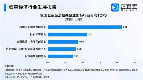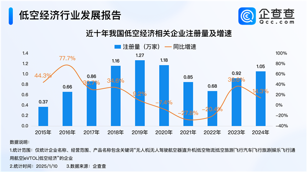 企查查数据显示,2024年我国低空经济相关企业注册量同比增加14.3%至1.05万家。企业存量方面,我国现存7.6万家低空经济相关企业,行业分布上,归属科学研究和技术服务业的企业最多,占比28.5%,归属交通运输、仓储和邮政业的企业占比11.7%;注册资本区间分布上,我国低空经济相关企业注册资本超千万的企业占比近三成。