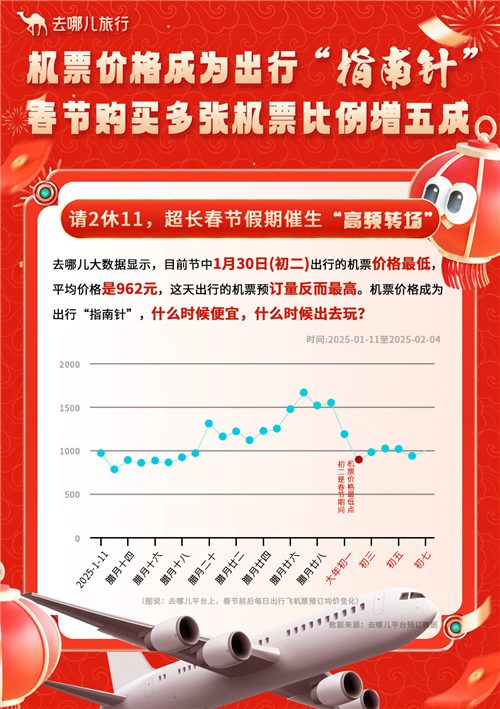 节中出行、节后返程的车票和机票相对充足,机票价格回落空间还较大。去哪儿大数据显示,目前节中1月30日(初二)出行的机票价格最低,平均价格是962元,这天出行的机票预订量反而最高。足够长的假期,以及较为便宜的机票价格,也让大家团圆+出游两不误。越来越多人选择最快捷的“转场”方式——坐飞机,春节期间购买多张机票的旅客比例同比增五成。