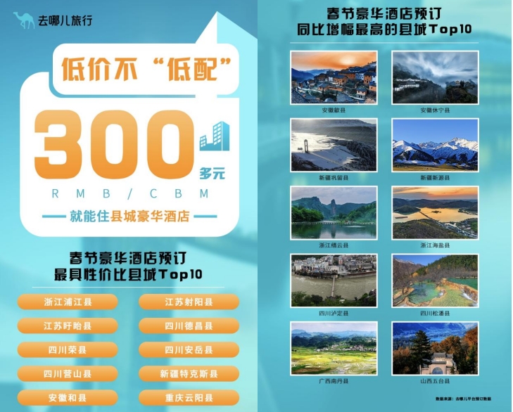 靠近风景区、去年新开豪华酒店较多的县城,春节预订量增幅最快。去哪儿数据显示,今年春节期间,豪华酒店预订同比增幅最高的县城Top10是:安徽歙县、休宁县,新疆巩留县、新源县,浙江缙云县、海盐县,四川泸定县、松潘县,广西南丹县、山西五台县。
