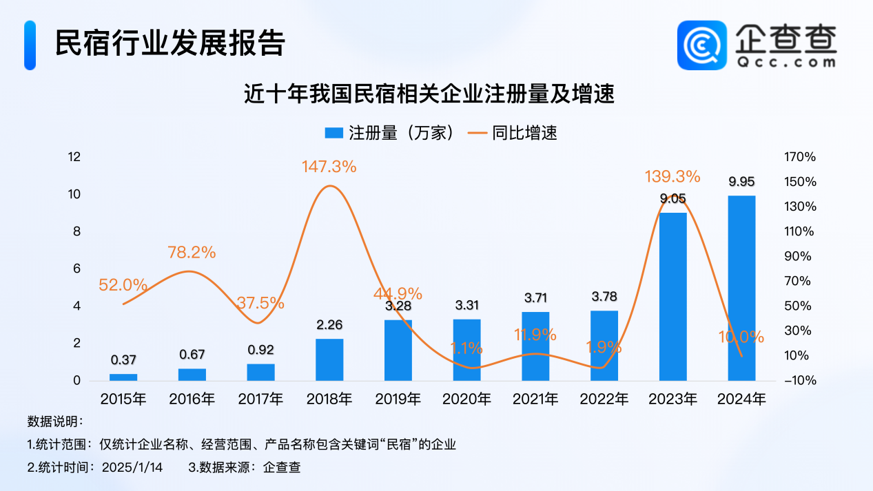 企查查数据显示,近十年,我国民宿相关企业注册量逐年增加,其中2018年同比大幅增加147.3%至2.26万家,成为近十年相关企业注册量增速最大的一年;2023年,全国经济强势复苏,往年抑制的旅游需求迎来爆发,带动全年民宿相关企业注册量同比大幅增加139.5%至9.05万家,2024年保持该趋势,全年注册量同比增加10%至9.95万家,创近十年注册量新高。