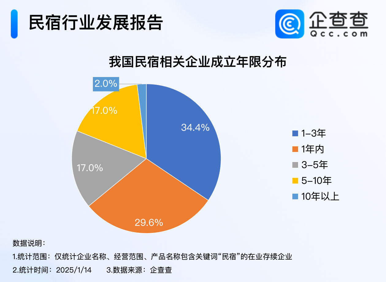 企查查数据显示,我国现存32.3万家民宿相关企业。成立年限上,我国超六成民宿相关企业在3年内成立,其中成立1-3年的企业最多,占比34.4%,成立1年内的企业占比29.6%;成立10年以上的企业最少,占比2.0%。