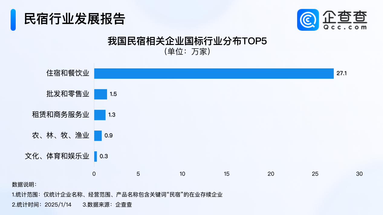 企查查数据显示,我国民宿相关现存企业主要集中在住宿和餐饮业,有27.1万家,占比84.1%;归属批发和零售业、租赁和商务服务业的企业分别有1.5万家、1.3万家,分占4.5%、4.0%。