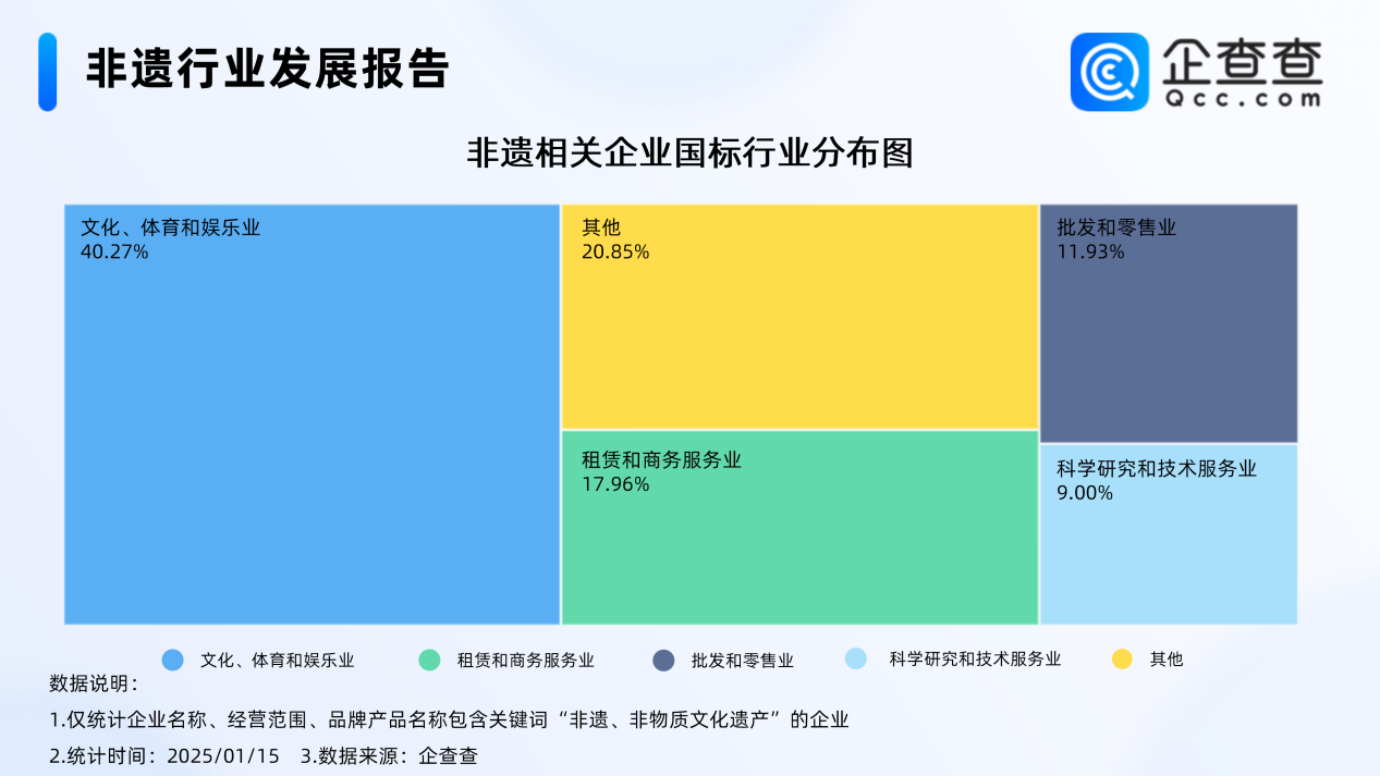 企查查数据显示,从国标行业的分布来看,非遗相关现存企业中,归属于文化、体育和娱乐业的相关企业占比最大,达40.27%,其次,归属租赁和商务服务业的非遗相关企业占比17.96%。此外,非遗相关企业在批发和零售业、科学研究和技术服务业也多有分布。