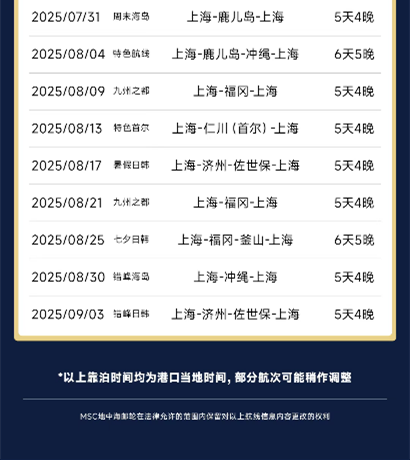 MSC荣耀号于2019年下水,是MSC地中海邮轮斥巨资打造的“传奇”级邮轮,代表了全舰队的至高品质和标准。她最大载客量为5,686人,总登记吨位达17.2万吨,共配备2,217间高品质舱房。继2024年在上海和深圳母港圆满完成首航季后,MSC荣耀号将在2025年1至3月的寒假春节出游季和7至9月的夏日出游高峰,带领宾客前往福冈、佐世保、冲绳、济州、釜山、仁川等日韩免签*目的地。