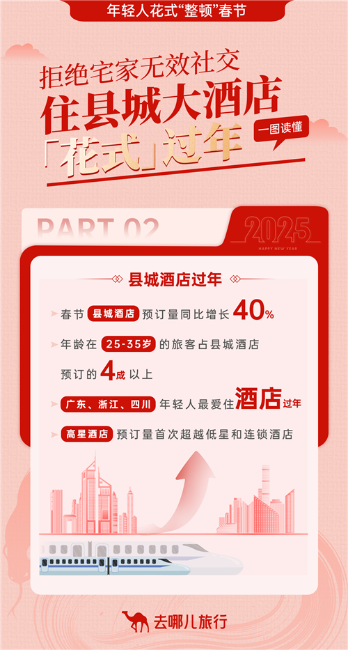 去哪儿数据显示,今年春节县城酒店预订量同比增长四成。从客源来看,年龄在25-35岁的旅客占县城酒店预订的四成以上。