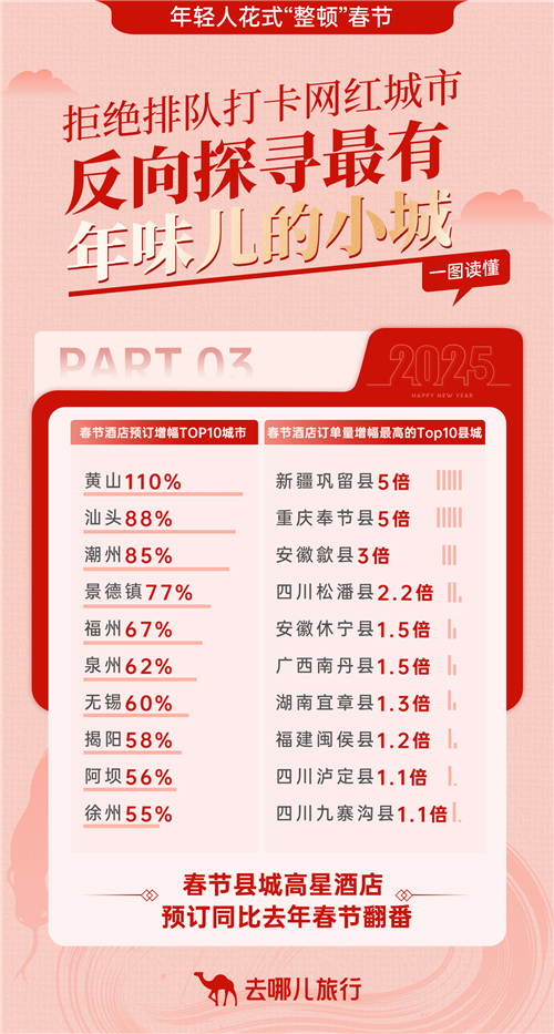 从去哪儿平台上春节酒店预订量增幅来看,热度蹿升最快的都是“年味儿”爆棚的小城。蕴含“登高”意头,今年新增众多非遗表演的黄山,人气爆棚,黄山市春节期间酒店预订量同比增长了逾一倍;年味浓厚、还有许多特色民俗的广东潮汕地区赢“麻”了,汕头、潮州酒店预订量均同比增长八成;气候好、美食多,还有“游神”加持,福建福州、泉州等预订量增六成。