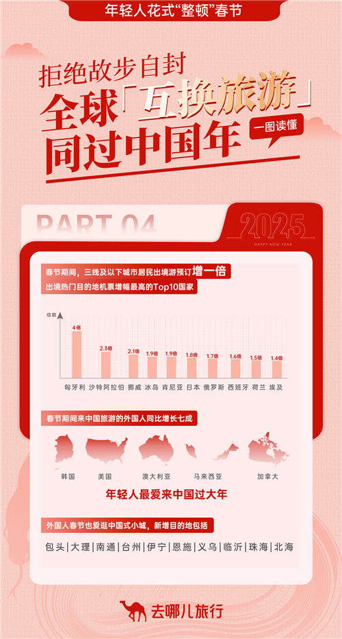 他们拒绝扎堆返乡,错峰团圆出游省钱又轻松;拒绝宅家无效社交,住县城大酒店“花式”过年;拒绝去网红城市排队“打卡”,反向出游探寻最有年味儿的小城;拒绝故步自封,中国青年闯北极看极光,外国小哥小姐姐来一场China Travel,全世界“互换旅游”。