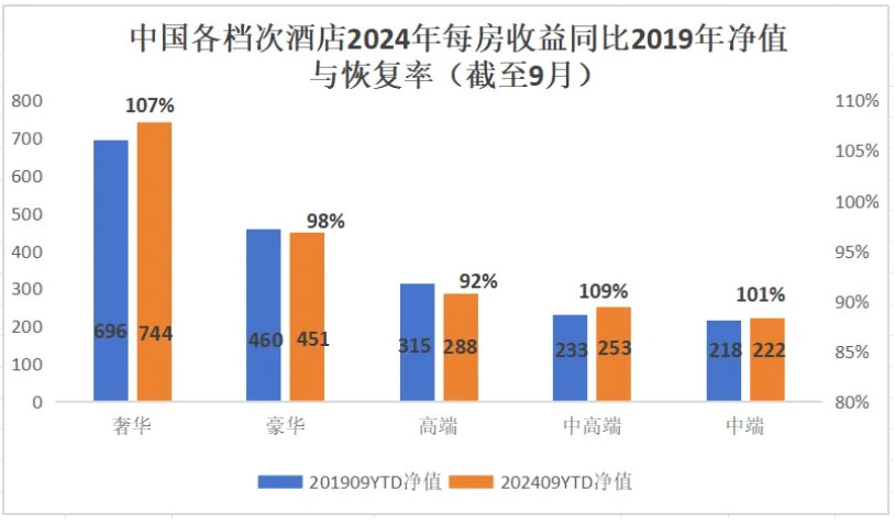 劲旅君最近关注到STR的一个统计数据,中国各档次酒店2024年每房收益同比2019年的净值与恢复率(截止2024年9月)显示出两个极端需求表现:一方面,奢华酒店、中高端及中端酒店需求持续旺盛,数据全面反超2019年同期;另一方面,豪华和高端酒店却出现需求疲软现象,数据恢复远不如2019年同期。
