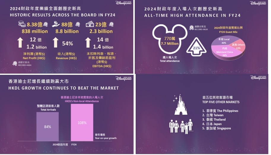 2025年2月25日 ,香港迪士尼乐园度假区 (香港迪士尼) 公布2024财政年度业绩(2024财政年度由2023年10月1日开始至2024年9月28日结束) 及度假区最新发展。主题乐园录得自2005年开幕以来最高的净利润、EBITDA、收入和入场人次。