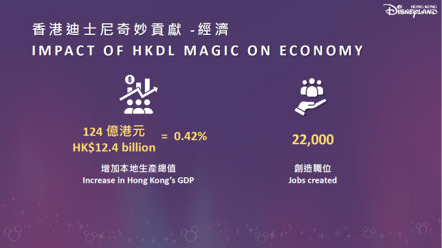 ·香港经济支柱:香港迪士尼访客于2024财政年度在香港的额外消费 (与没有香港迪士尼的情况相比) 达到 216 亿港元。计及香港迪士尼访客额外消费所产生的直接及间接增加值,香港迪士尼作为单一企业,在 2024 财政年度为本港带来约 124 亿港元的增加值,相当于香港本地生产总值(GDP)约 0.42%,并创造约22,000 个就业机会(以人工作年计算),为香港整体经济作出积极贡献。