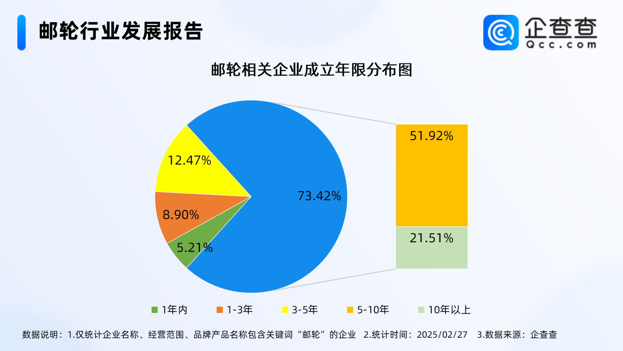 企查查数据显示,从成立年限来看,超七成邮轮相关企业的成立年限在5年以上,其中成立年限在5-10年的企业最多,占比51.92%。成立年限在10年以上的相关企业占比21.51%。成立年限在1年内的相关企业占比5.21%。