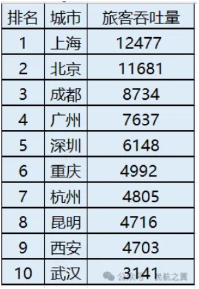 可以看到,上海、北京稳居全国前二,而成都超过了广州,跻身民航客流量第三城之位。