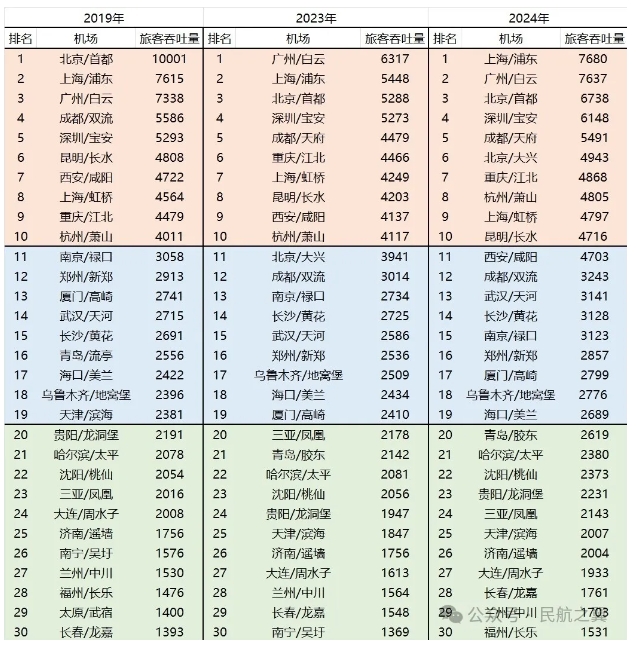 2019、2023年、2024年我国境内机场旅客吞吐量前30强 单位:万人次