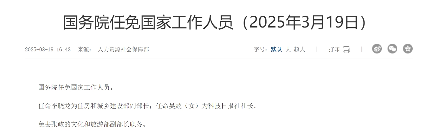 3月19日,国务院发布任免国家工作人员公告。任命李晓龙为住房和城乡建设部副部长;任命吴兢(女)为科技日报社社长。免去张政的文化和旅游部副部长职务,据媒体此前报道,今年3月,张政已任中国文联党组书记。