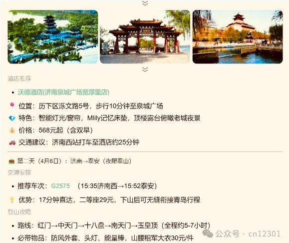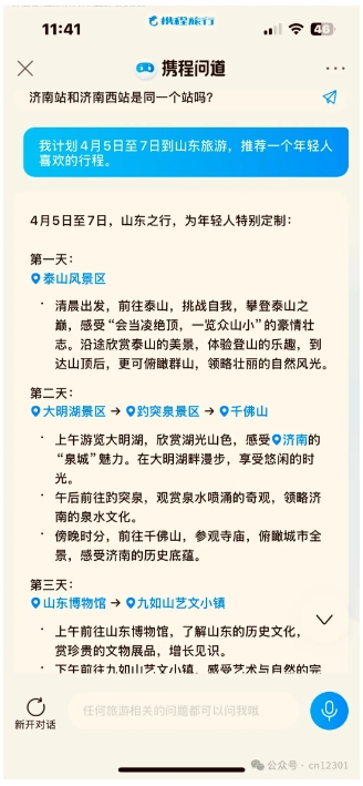 2025年3月24日,同程旅行发布“程心AI”升级版,推出全新域名——“DeepTrip.com”。一个显着的进步是把交通方式车次时间放在行程里,有文有图。也有符合年轻人的旅游方式“夜爬泰山”。缺点是交通时间和行程衔接的不太好,如上图竟然空出半天时间;吸引物信息同样有点“老”。