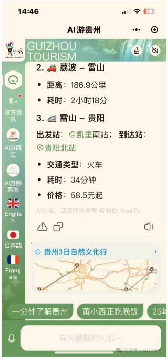 评一评:可称作“西南王”,测试题也换成“贵州”。马蜂窝AI策略从目的地下手,上线小程序“AI游贵州”,又拿下江西,其手机应用上没有明显AI入口。亮点是引入了电子地图标识行程,行程中有粗略的交通方式和时间,吸引物信息算不上“年轻”。