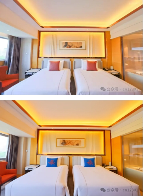 输入AI山东大厦客房照片,如果把小枕头换成蓝色的,上面绣上红色的花纹,看看效果。