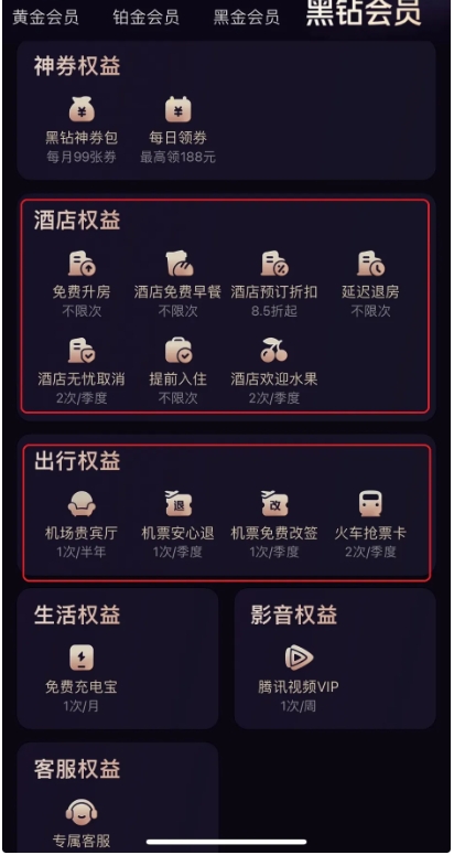美团黑钻会员更是尊享19.9元购买“神券”年卡、无限次酒店免费升房及免费早餐、专属客服、充电宝、视频VIP等一系列重磅权益。