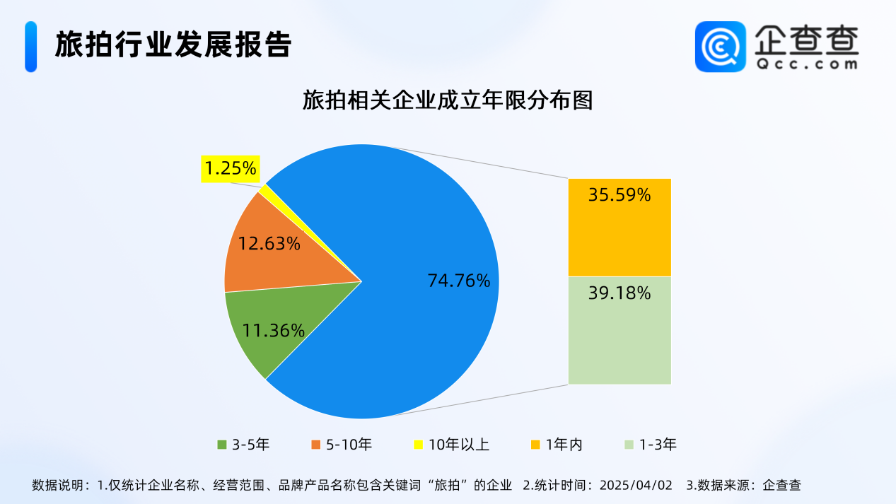 企查查数据显示,从成立年限来看,超七成旅拍相关企业的成立年限在三年内,其中成立年限在1-3年的相关企业最多,占比39.18%。其次成立年限在1年的相关企业占比35.59%。成立年限在10年以上的相关企业占比1.25%。