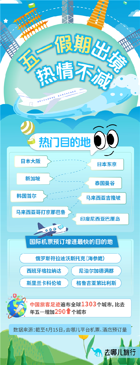 去哪儿平台数据显示,五一假期出境游预订也已进入高峰。中国旅客的目的地遍布全球1303个城市,比去年五一增加了日本门真、米子市,德国德累斯顿,英国布莱克浦等290个城市,预订增幅超过两成。