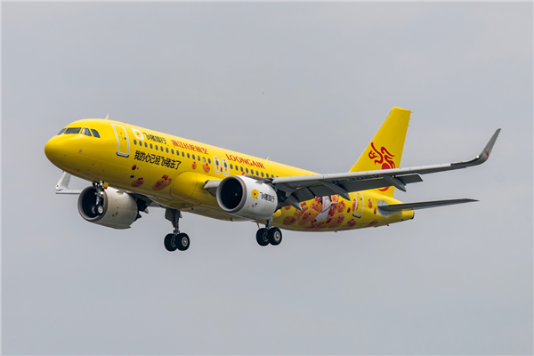 这架飞机身披飞猪主题彩绘,机身以醒目的黄色为主色调,侧面印有飞猪形象以及“跟着虞书欣去旅行”等巨幅大字。据了解,虞书欣是飞猪首位全球代言人。