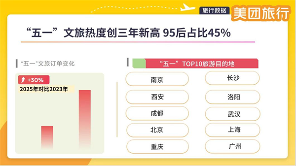 音乐节人头攒动、多地景点“约满”“售罄”、县城五星酒店一房难求、老字号美食排队1小时起、多城迎来堵车“堵山”“堵海”模式......5月5日,美团旅行发布2025“五一”假期吃喝玩乐消费洞察。据美团旅行数据,在味蕾游、演出游、赶海游、奔县游等多样玩法推动下,人们出游热情高涨,今年“五一”假期,文旅热度创近三年新高,文旅订单较2023年同期增长30%,TOP10热门目的地为南京、西安、成都、 北京、重庆、长沙、洛阳、武汉、上海、广州,其中,由异地游客贡献的餐饮堂食线上交易额较2023年激增189%。