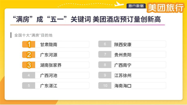 “五一”期间,美团酒店预订量创下历史峰值,甘肃陇南、广东河源、湖南张家界领衔全国十大“满房”目的地,充满历史人文风情的西部地区正在“冒头”进入更多游客的视野。
