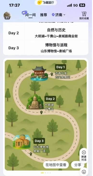 另外,OTA的AI战线烽火连天,飞猪AI和同程AI已经可以为游客提供旅行行程的车票、酒店的预订链接和手绘地图。