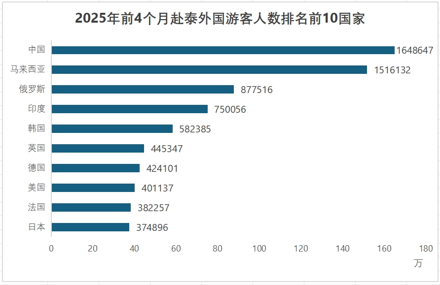 尽管在2025年前四个月,中国依旧以近165万人次的客流量位居泰国第一大海外客源国,但与第二名马来西亚的近152万人次的客流量差距迅速缩小。
