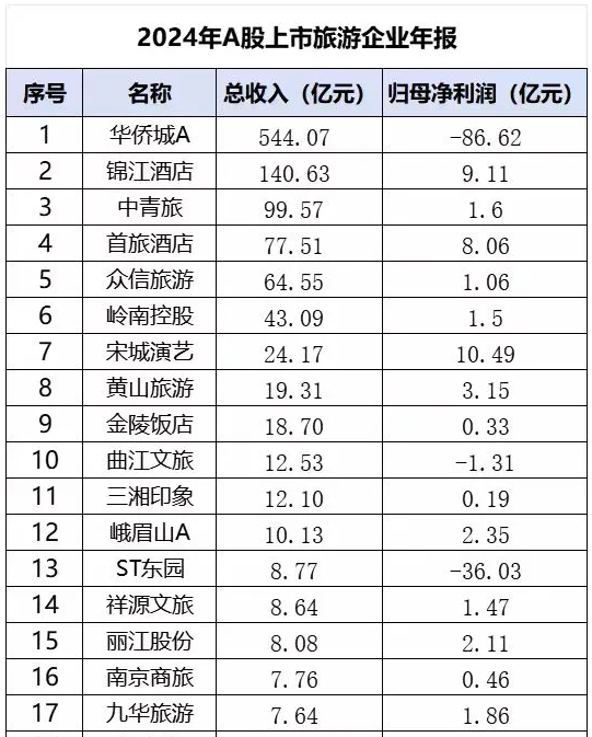 2024年报数据进一步印证了其良好势头。在A股34家上市旅游企业中,总收入前三名为华侨城A、锦江酒店、中青旅;归母净利润前三名为宋城演艺、锦江酒店、首旅酒店。