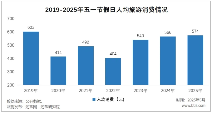 官方统计数据显示,今年五一国内旅游人均消费为574元,依然低于2019年的603元,为疫情前的95.19%,至今未全面超越。
