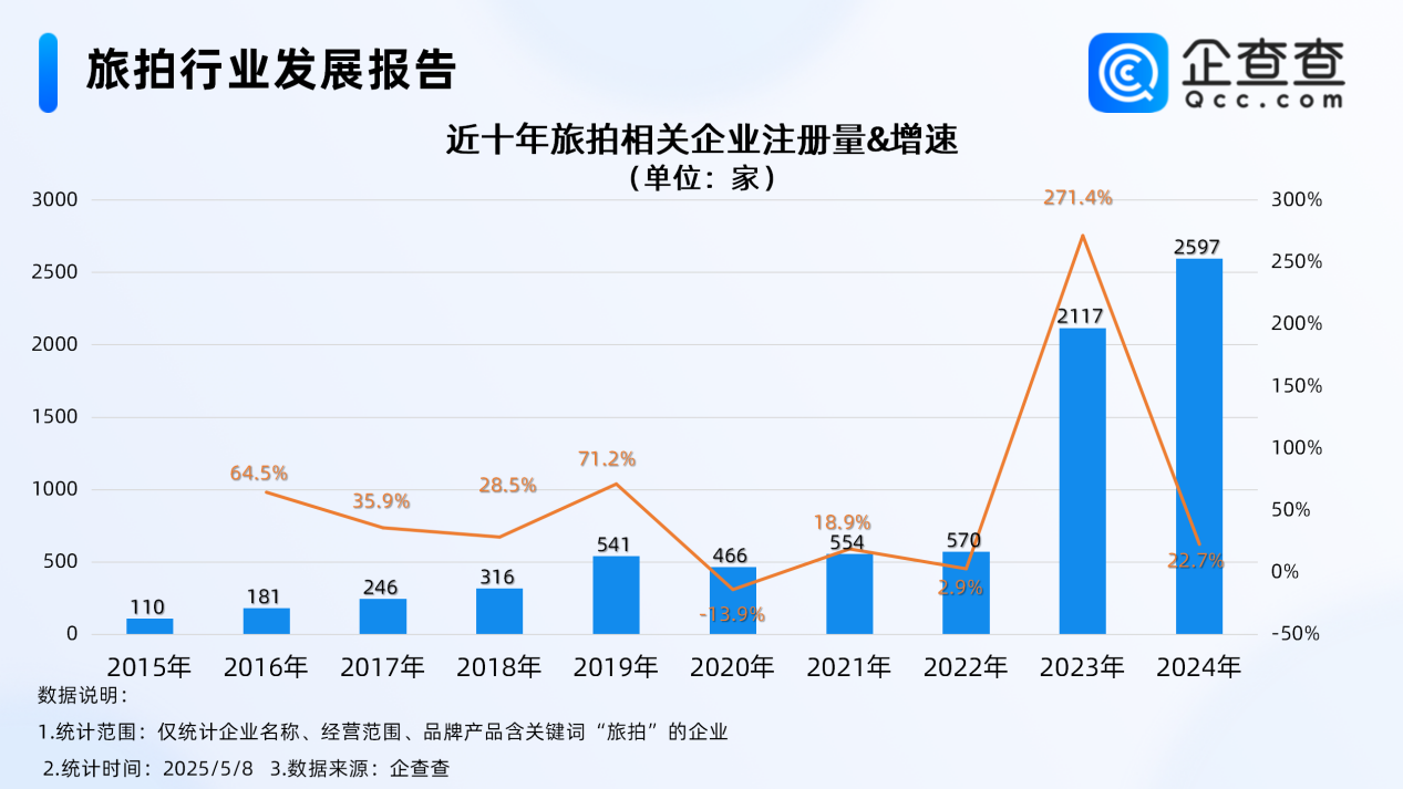 企查查数据显示,从注册量角度来看,2015年-2022年,旅拍相关企业年注册量基本维持在100-600家,2023年旅拍相关企业注册量迎来爆发,达2117家,同比增长271.4%,2024年延续增势,注册量同比增长22.7%至2597家。