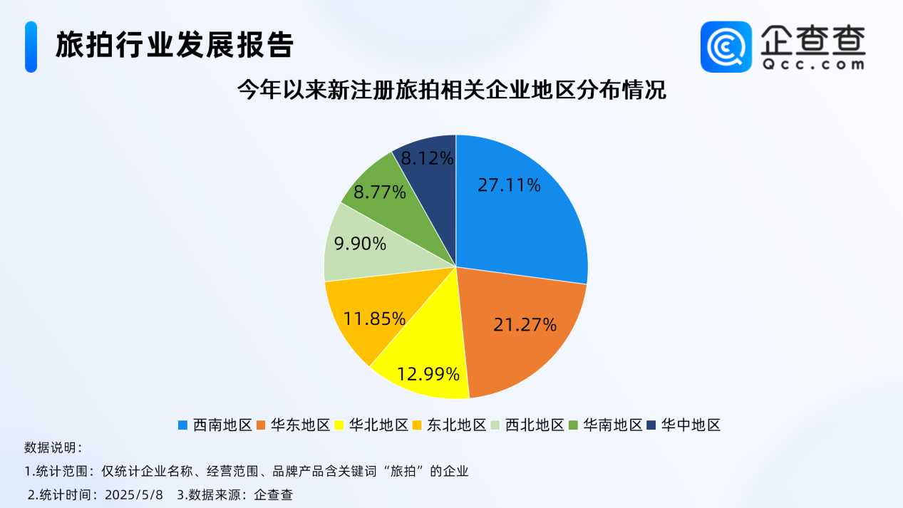 企查查数据显示,截至目前,今年已注册616家旅拍相关企业。这616家新注册企业主要集中分布在西南、华东地区,分别占比27.11%、21.27%。西南地区、华东地区热门景区云集,旅游大省云南、四川、上海、江苏、浙江等均地处这两地。