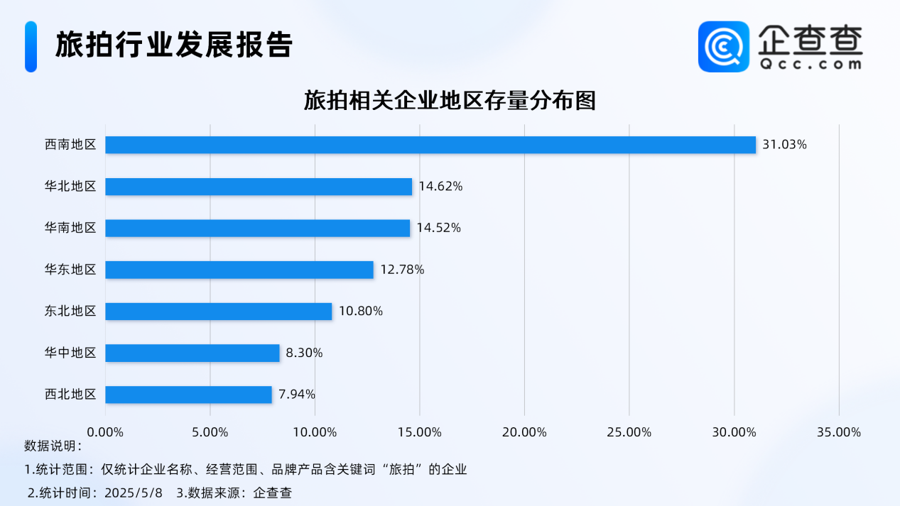 企查查数据显示,截至目前,国内旅拍相关现存企业已突破6000家,达6156家。主要集中分布在西南地区,占比达31.03%,其次为华北、华南、华东地区,分别占比14.62%、14.52%、12.78%。