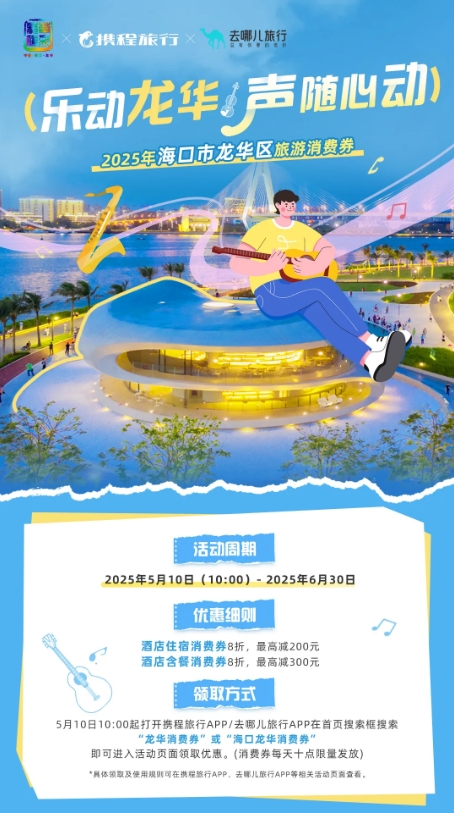 本次消费券活动周期为2025年5月10日至2025年6月30日,覆盖海口市龙华区在携程旅行及去哪儿旅行上线的部分酒店及酒店含餐的产品。消费券每日十点限量发放,数量有限,先到先得。活动期间同一平台可领取每一种优惠券各一次,已领取但未在有效期内使用的券码过期作废后可重复领取。