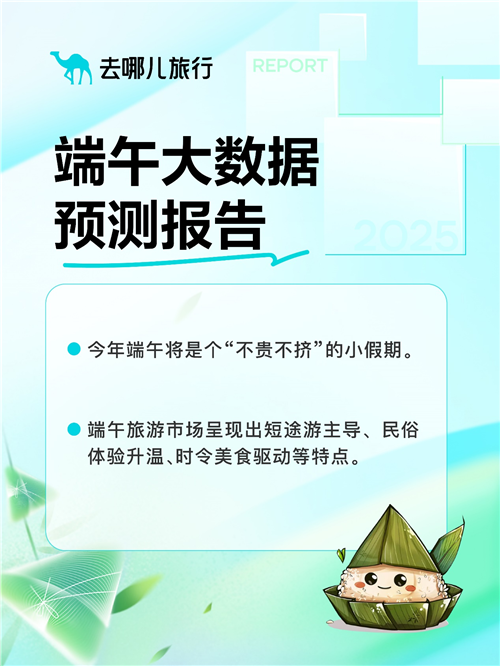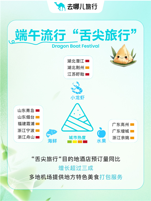 去哪儿大数据研究院研究员肖鹏表示:“尽管今年端午不是旅游旺季,但高铁网络扩展了美食半径,更多旅客能到原产地品尝美食;民俗活化提升文化质感,与之相关的景区也获得旅客青睐。中国传统节日正以更丰富的维度满足人们对文旅消费的深层期待。”
