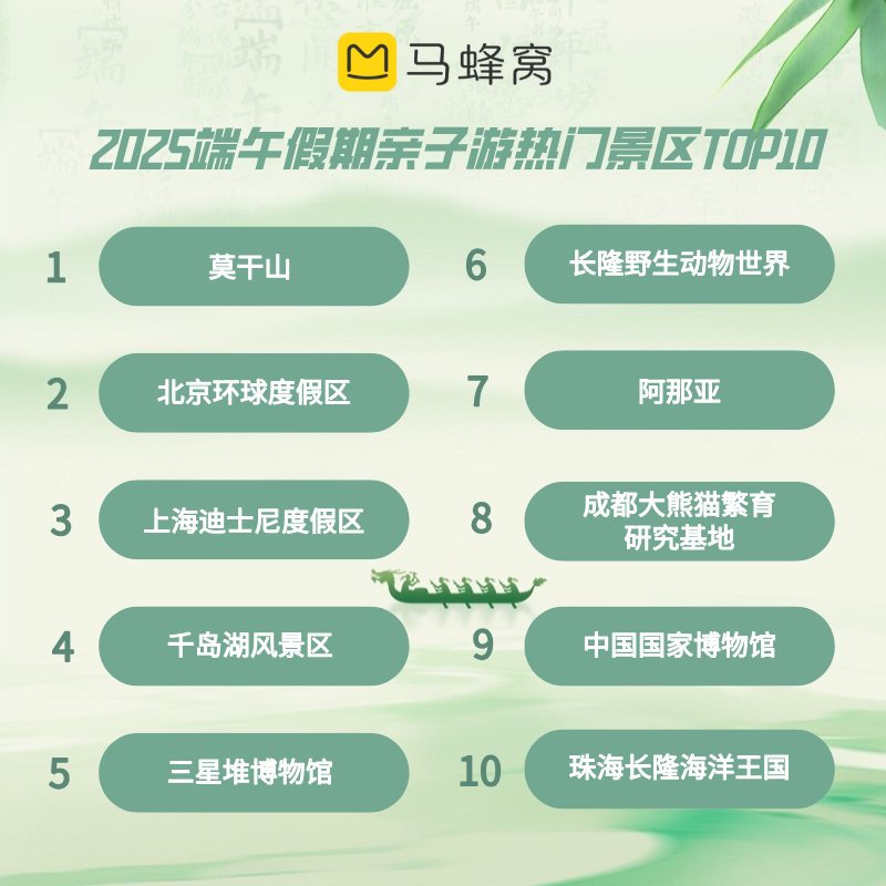 与“六一”撞档,让亲子游在端午提前迎来小高潮,拥抱自然、乐园撒欢、增长见闻、与动物亲密接触成为亲子家庭的热?选择,各地主题乐园、动物园以及文博场所迎来大批亲子客群。既可以满足儿童游乐,又适宜全家度假的莫干山登上端午亲子游热门景区榜首,热度大涨266%,“莫干山民宿”热度增长100%,北京环球度假区和上海迪士尼度假区紧随其后。