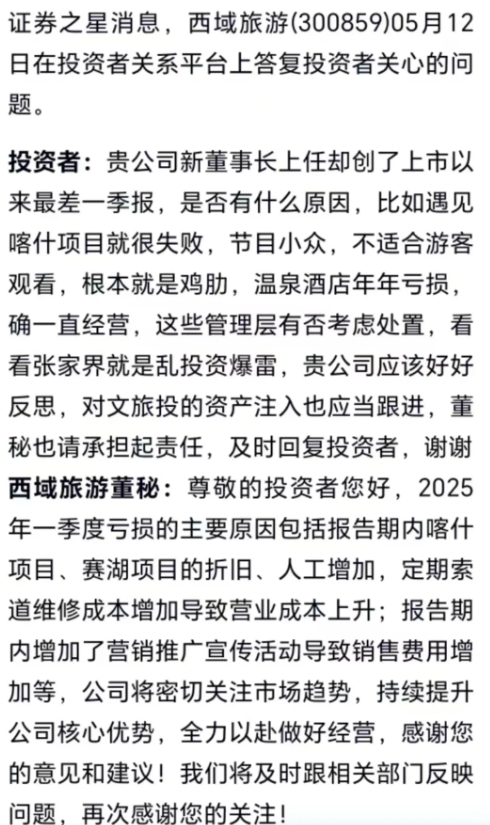 近日,有投资者在投资者关系平台上向“新疆旅游第一股”西域旅游发出辛辣质疑:“贵公司新董事长上任却创了上市以来最差一季报,是否有什么原因”。
