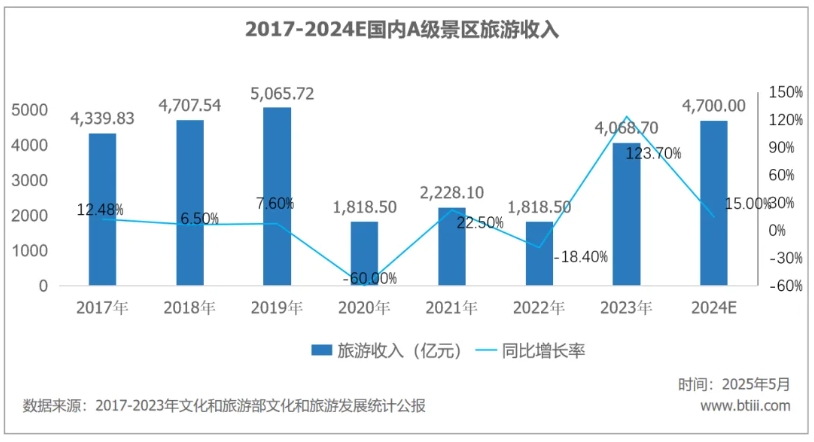 《报告》显示,2024年,国内A级景区实现旅游收入约4700亿元,相较2023年同期的4068.7亿元同比大涨15.51%。