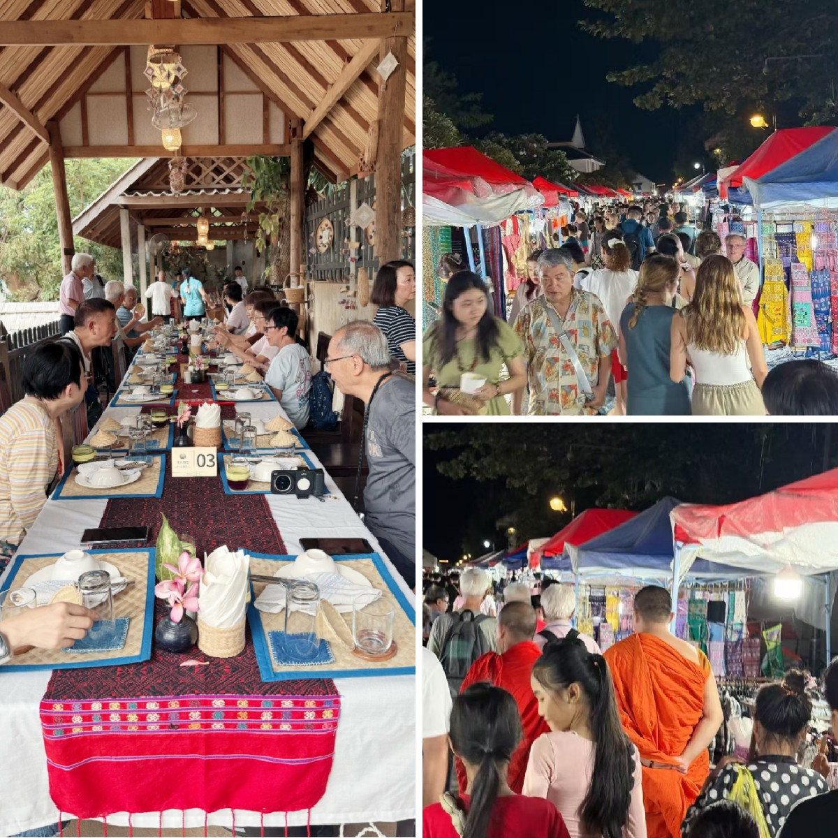 傍晚返回琅勃拉邦市区,品尝特色老挝风味餐,在夜幕降临时,悠闲地行走在烟火气弥漫的琅勃拉邦夜市,光影交错,摊位星罗棋布,琳琅满目的当地民族手工艺品和特色小吃。