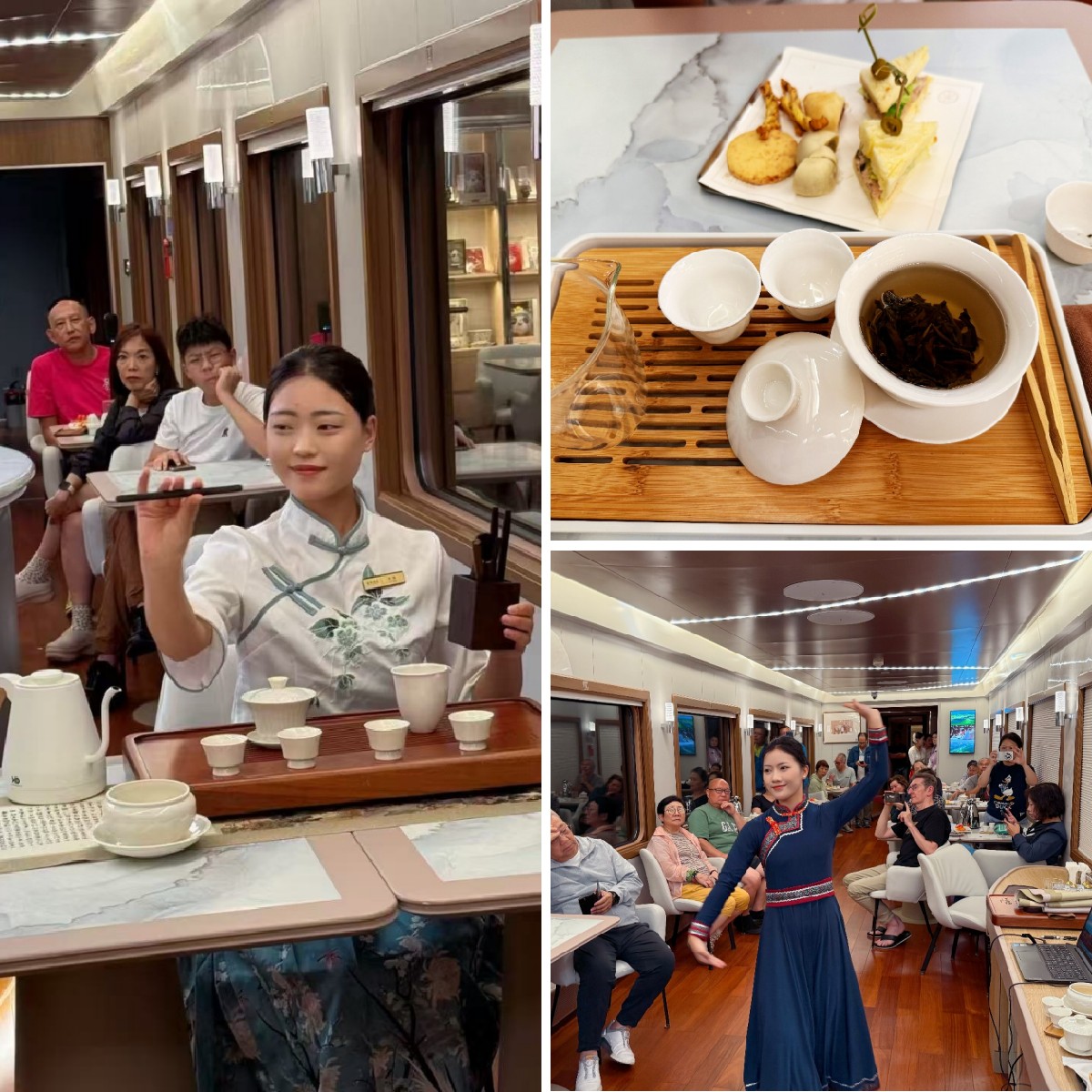 第七天,在列车上体验由管家团队带来的茶道体验和精彩的民族舞蹈表演,客人们纷纷拍照留念,记录美好同行瞬间。