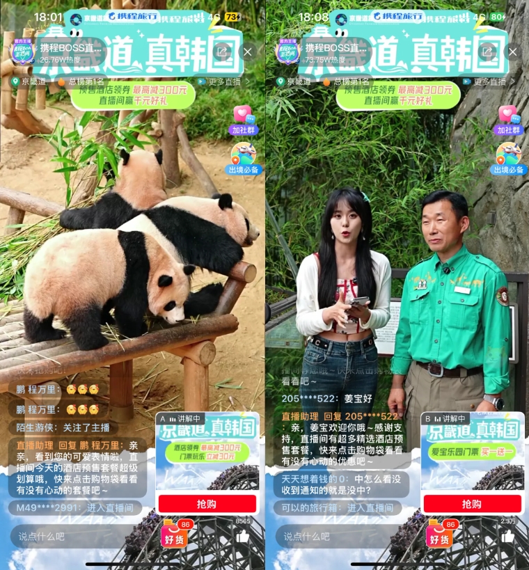 直播间内,携程同步上线了一系列京畿道酒店、门票、日游、跟团游等福利产品,引发观众即时下单热潮。期间推出的“爱宝乐园一日票买一赠一”惊爆价套餐,仅需271元即可实现双人同行,成为直播间呼声最高的必抢清单。此外,京畿道旅游发展局与携程平台深度联动,带来酒店预售最高满减300元、门票玩乐立减30元等优惠,全面释放目的地吸引力。